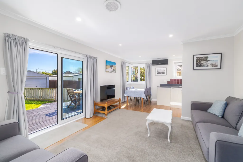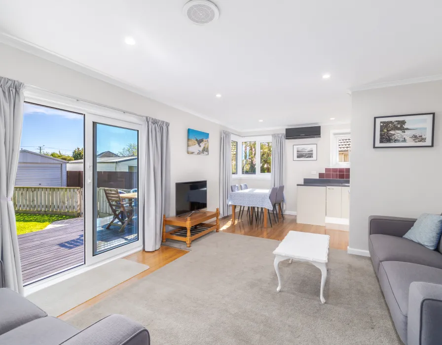Everyday life gathers in a light-filled open-plan living zone, where sliding doors extend the focus to the deck, inviting both outdoor entertaining and relaxed afternoons.