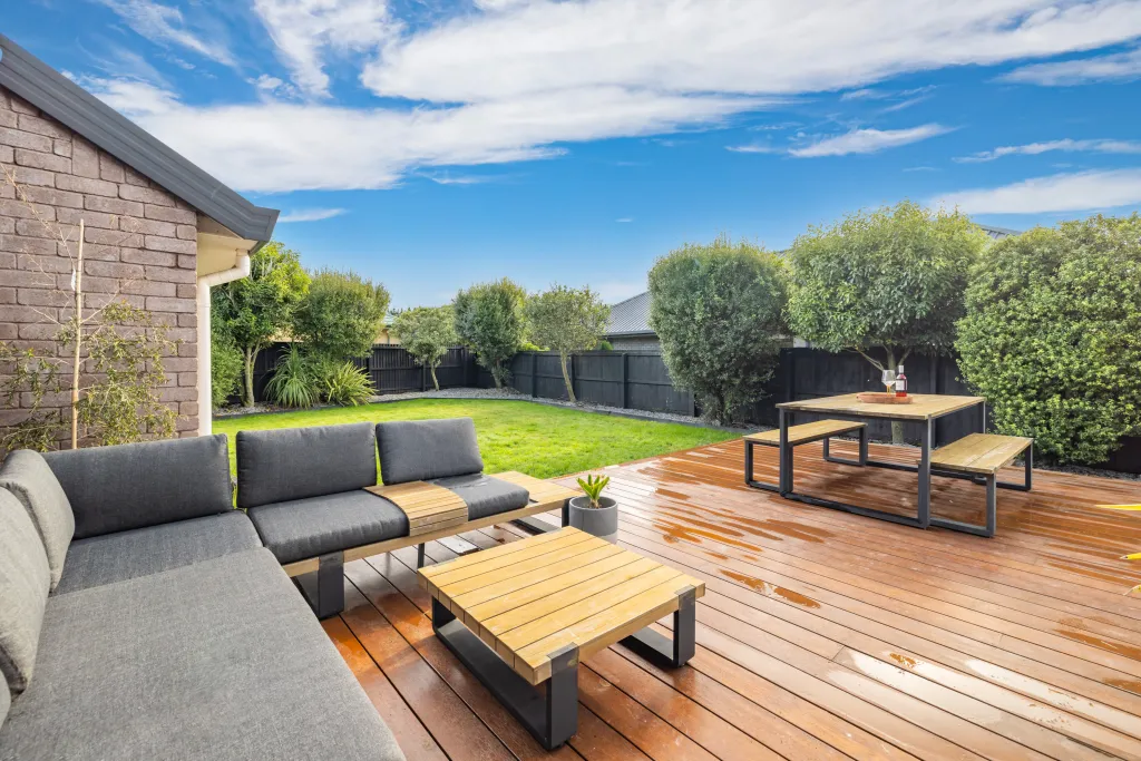 heating, ceiling speakers, kwila decking and a large garden shed.