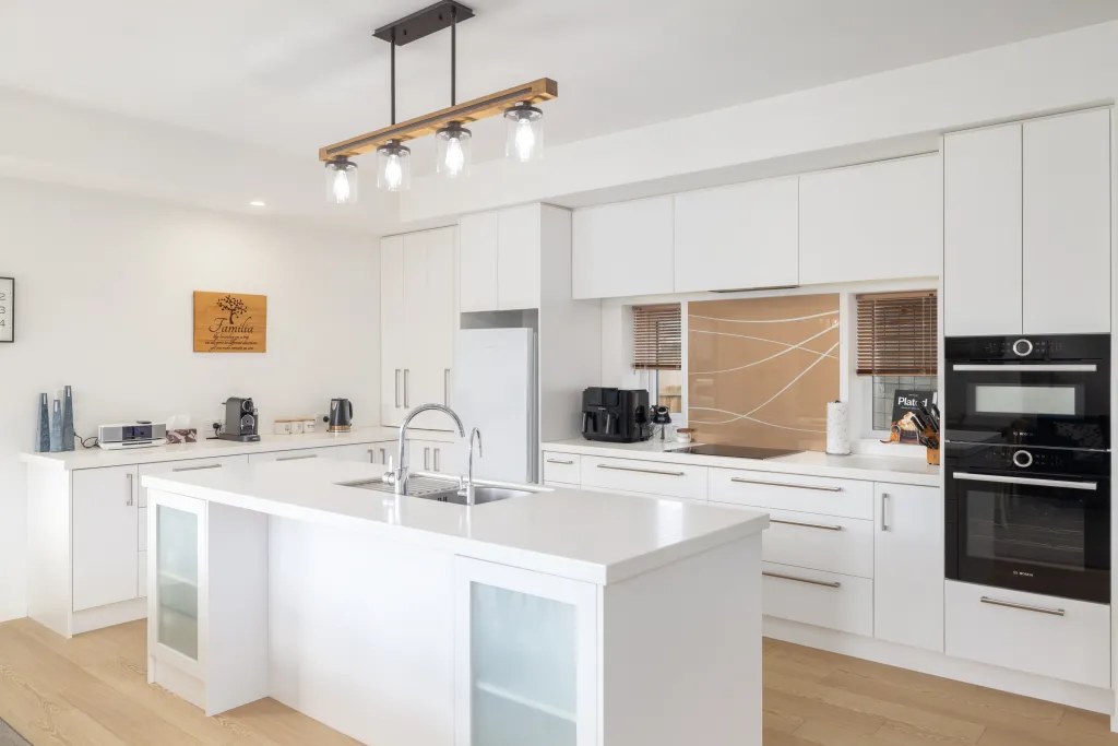 The kitchen commands centre stage with its crisp lines, Bosch appliances, and seamless transition to the north-facing deck, where retractable screens shape the season to suit.